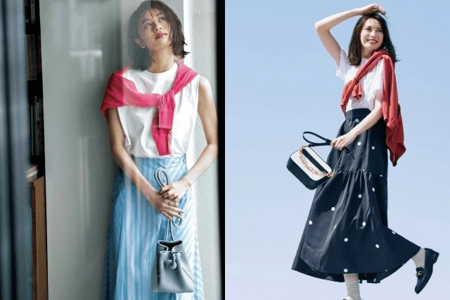左圖:流行和吸引人的粉紅色開衫,與藍色條紋裙子搭配,白色 T 是協調彩色單品的好方法,像夏天一樣清新而舒服。右圖:一件柔軟的白色T卹,與圓點的裙子配搭,看起來很清爽,肩部的一件暗橙色的針織衫,看似隨意,卻也提升色彩的豐富度,充分享受法式三色配色紅白藍的配色方案,帶來時髦的魅力。