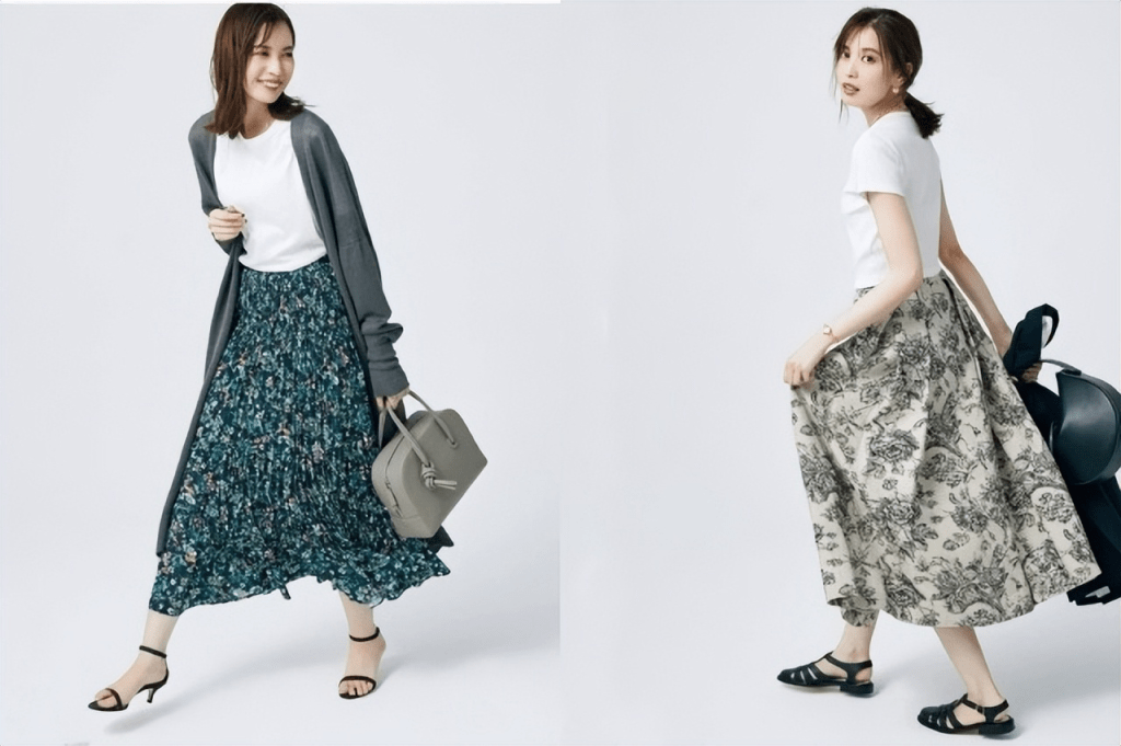 右圖:百搭短款 T 卹搭配花卉圖案的傘裙,輕鬆享受與百搭的白T恤的時尚感,帶有隨意搖擺的傘裙,帶有漂亮的廓形,所以要選擇上緊下鬆的造型。