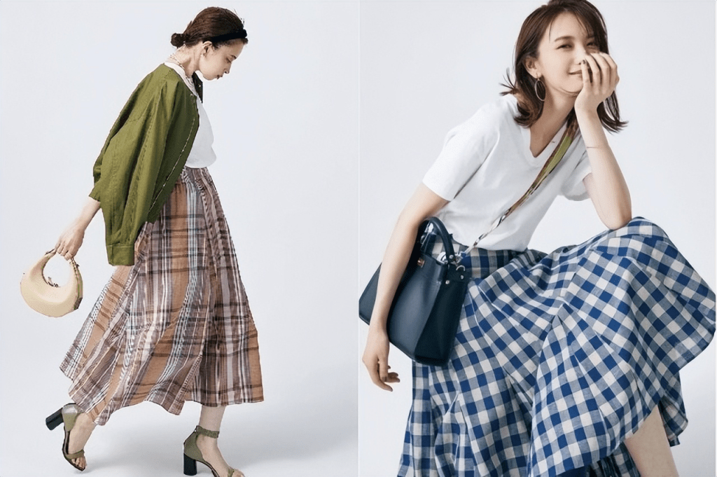 左圖:白色T卹搭配格子裙,一件橄欖綠色外套與暗粉色格子裙,為了獲得統一的協調感,正確答案是內搭白色T卹,看起來會更和諧。右圖:用 V 領的白色 T ,讓少女格子裙更加銳利一點,穿著舒服的質地,更添柔美之感。並且,藍白格紋中的白色與白色T協調吻合,更讓人平添一種融洽度。
