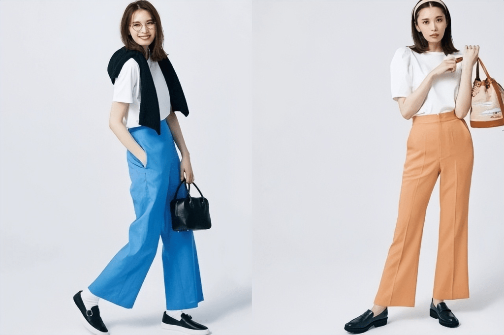 左圖:白色T和黑色開衫的對比,鮮明地突出了亮藍色的褲子,白色上衣與白色襪子,黑色鞋子與黑色針織衫,以及黑色包包,怕顏色單調,讓一條藍色褲子變得活潑可愛起來。右圖:有彈力的泡泡袖T卹看起來很優雅,為裝扮增添了流行的甜美感,泡泡袖 T + 喇叭褲的新平衡,更新了樸素的風格,變得時尚起來。