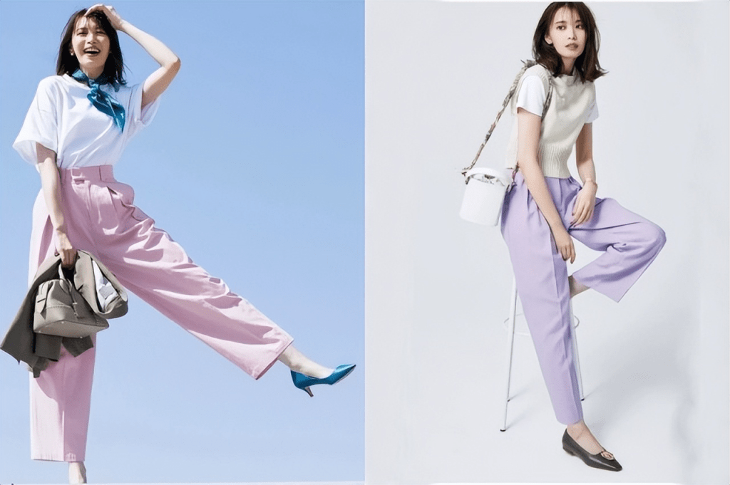 左圖:白色T恤的袖子是折疊袖,寬鬆的款式,感覺有點四四方方,那就塞進粉紅色的褲子的腰間,來增加一點緊緻和甜味,白色 也T 中和了粉色的可愛,引領熟女的摩登風格。右圖:緊緻的白T,平衡感很好,外面再搭配一件針織背心,在夏天很有用。薰衣草褲子加白色T卹,透明度和乾淨度也有所提高。
