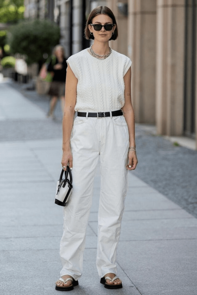 模特 Jacqueline Zelwis,展示了一套在夏日陽光普照的城市中,散發出端莊氣息的全白裝束。上衣是夏季針織,上裝和下裝統一白色,米色縫線為棉褲增添了微妙的氣息,給人一種涼爽的感覺。系上黑色腰帶並有收緊效果,通過在整體白色上,添加一點黑色,具有酷炫和時髦感。