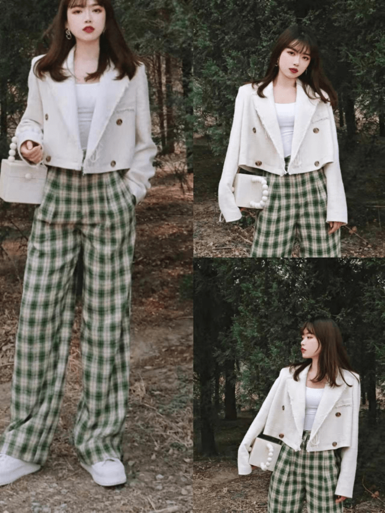 寬鬆的褲裝穿起來也會有一種無負擔的隨性大方感。白色短西裝搭配一條綠色的格紋闊腿褲,“綠白”配色清新舒適,一身白色西裝look看起來就十分養眼耐看! -