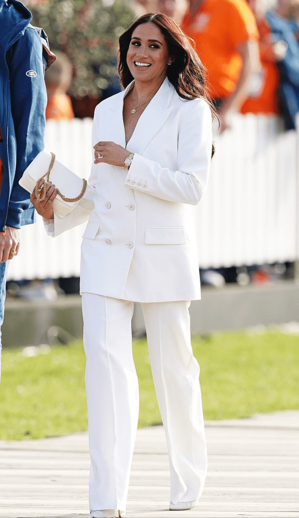 梅根在荷蘭的首套造型,是一條很有霸總風範的白色西服套裝。這樣的雙排扣西裝,盡顯職場女強人的氣勢。