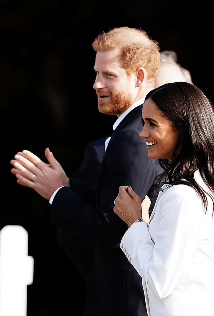 可以看到梅根脖子上和手上的雀斑還是非常多的,這次用她最為擅長的大波浪捲發凸顯出女人味,哈里在身邊依然是小跟班的感覺。